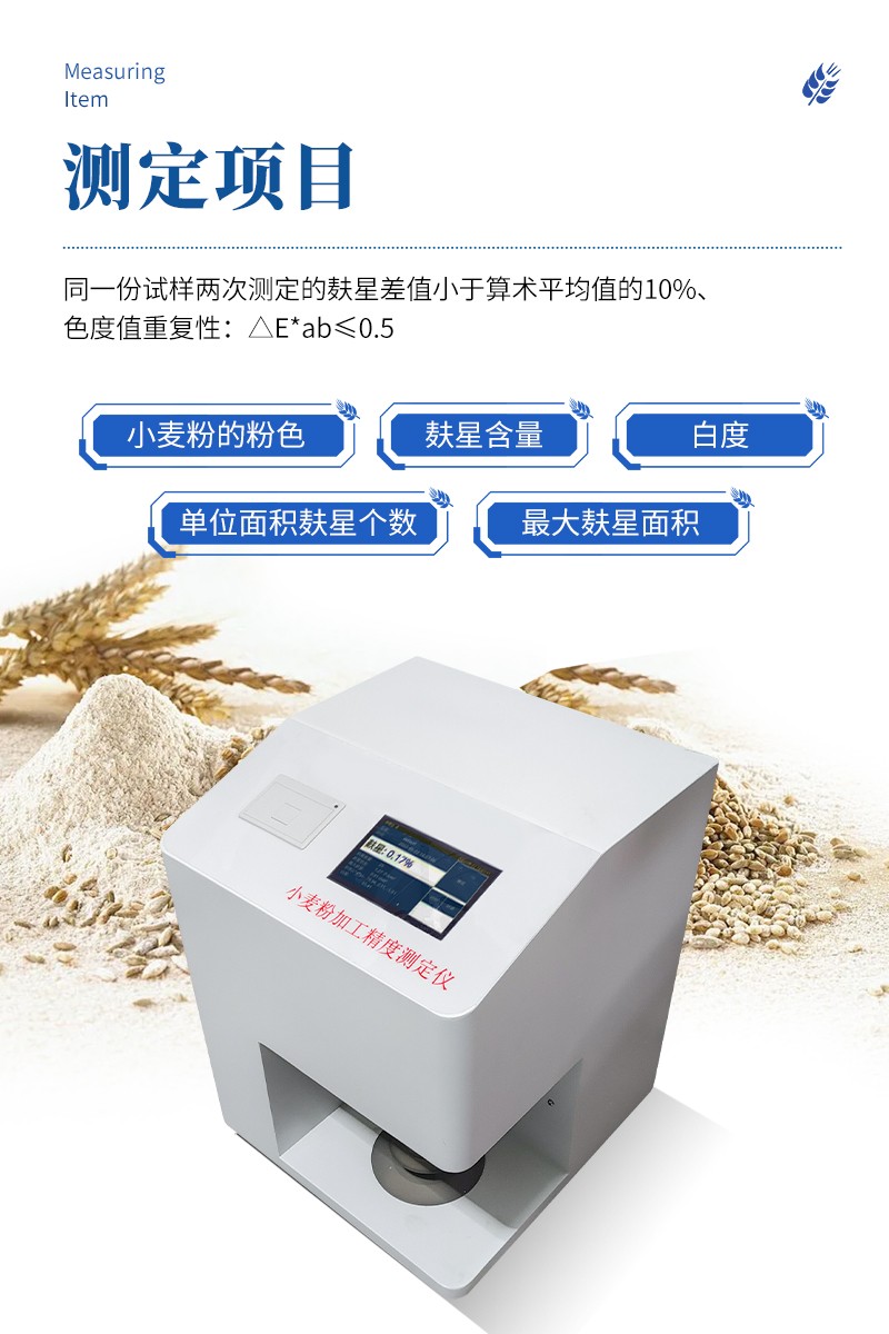 小麦加工精度测定仪测定小麦粉的粉色、麸星含量、单位面积麸星个数、**麸星面积、白度。同一份试样两次测定的麸星差值小于算术平均值的 10%、色度值重复性:△E*ab≤0.5