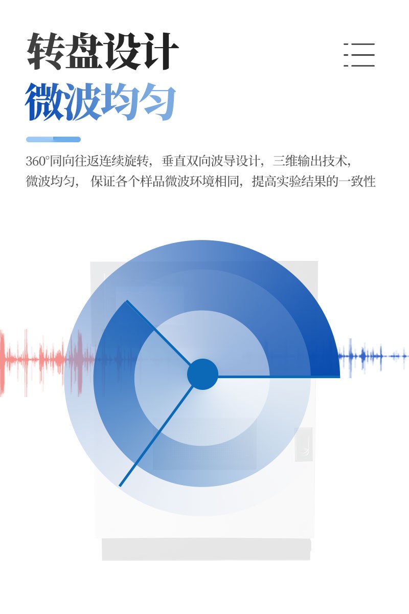 (9)转盘设计:360°同向往返连续旋转,微波均匀,保证各个样品微波环境相同,提高实验结果的一致性。