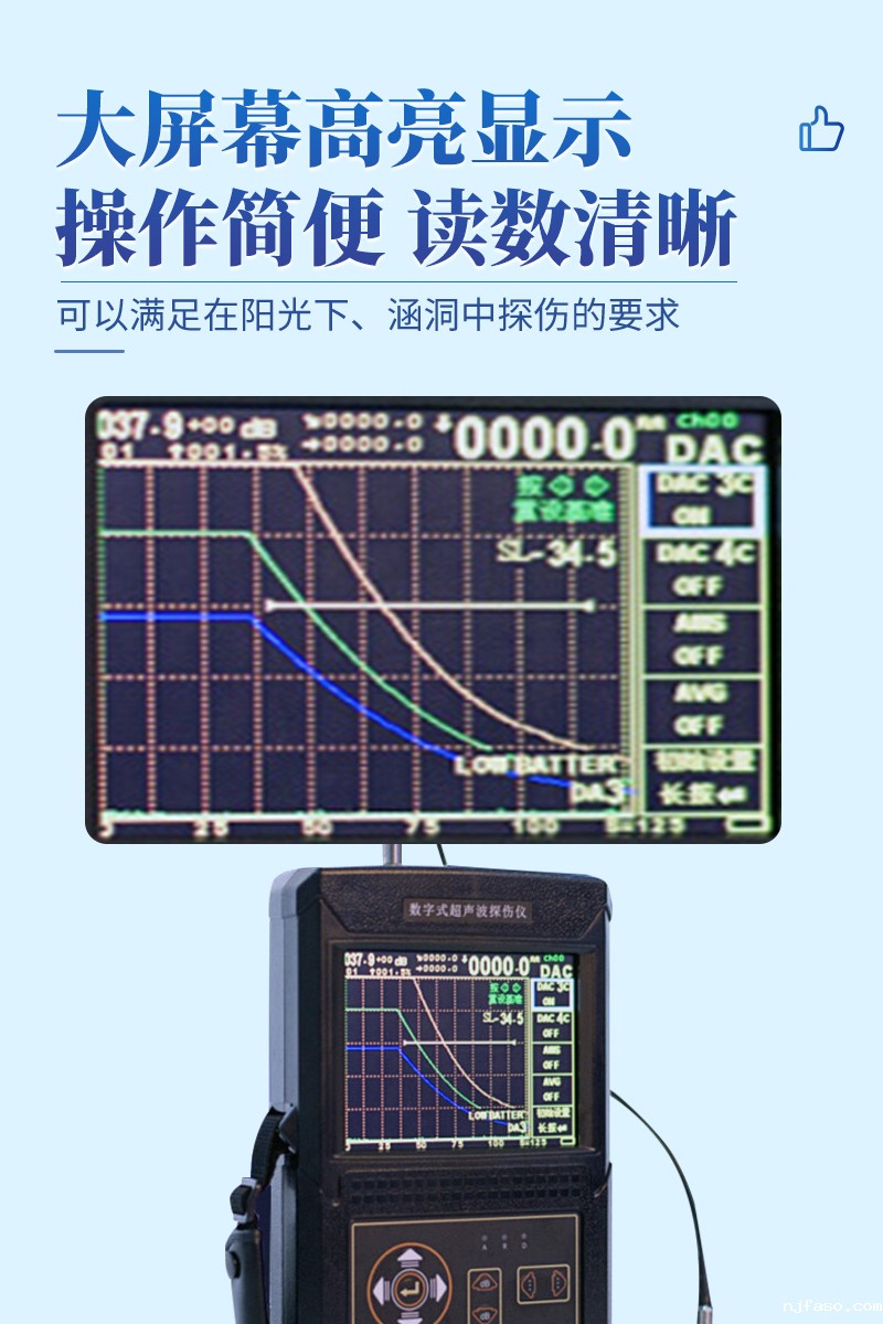 大屏幕高亮显示,可以满足在阳光下、涵洞中探伤的要求。