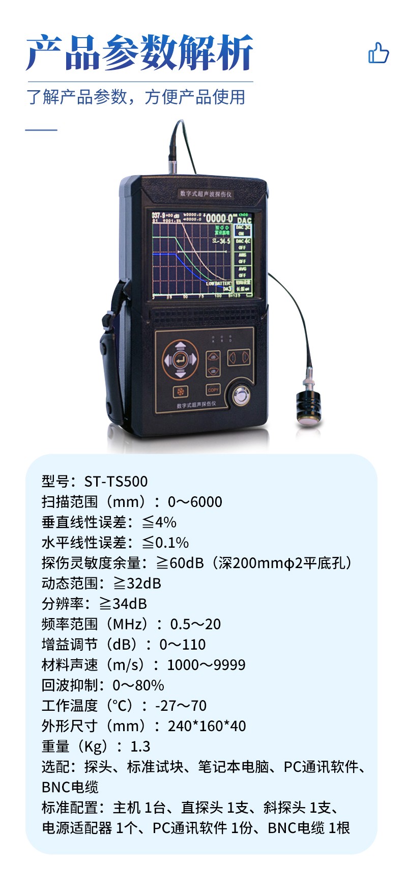 选配 | 探头、标准试块、笔记本电脑、PC通讯软件、BNC电缆 |
