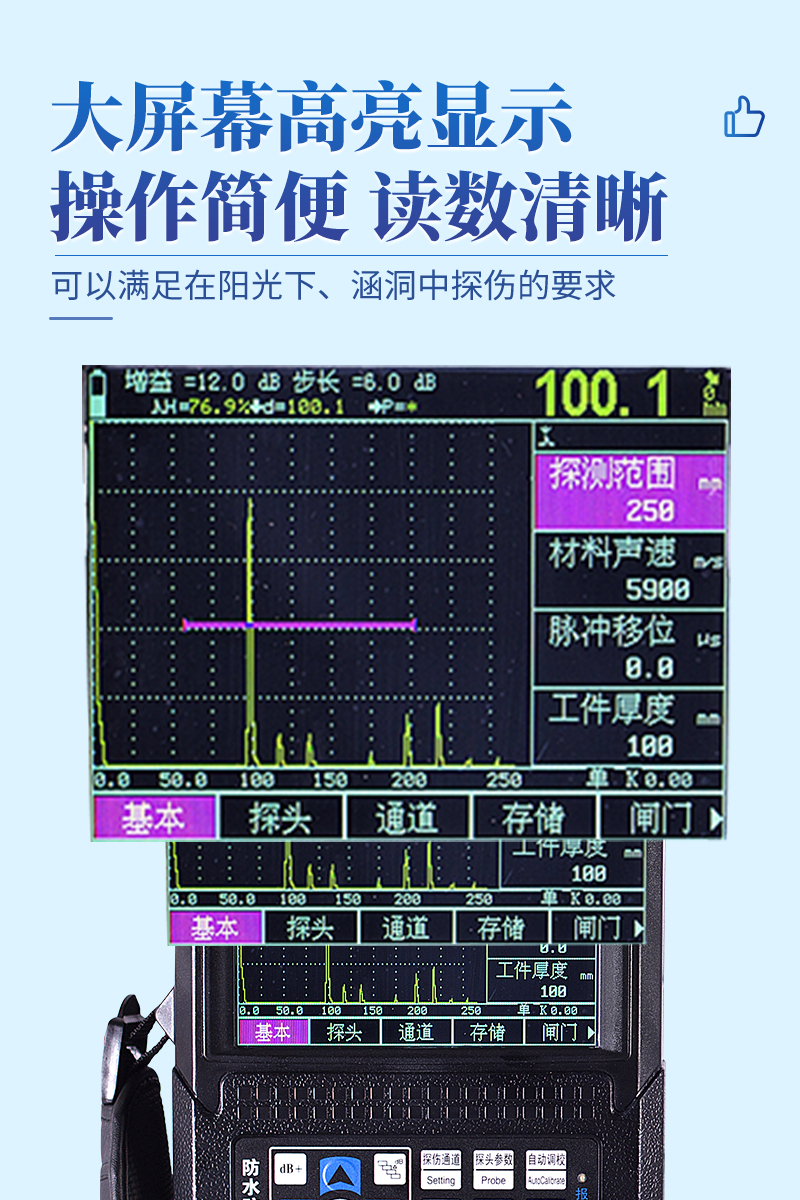 大屏幕高亮显示,可以满足在阳光下、涵洞中探伤的要求。