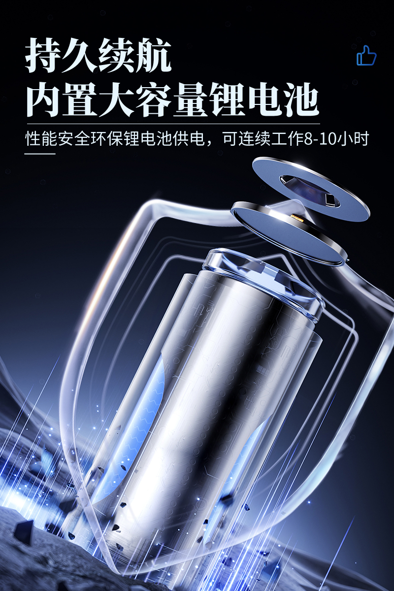 ● 性能安全环保锂电池供电,可连续工作10小时。