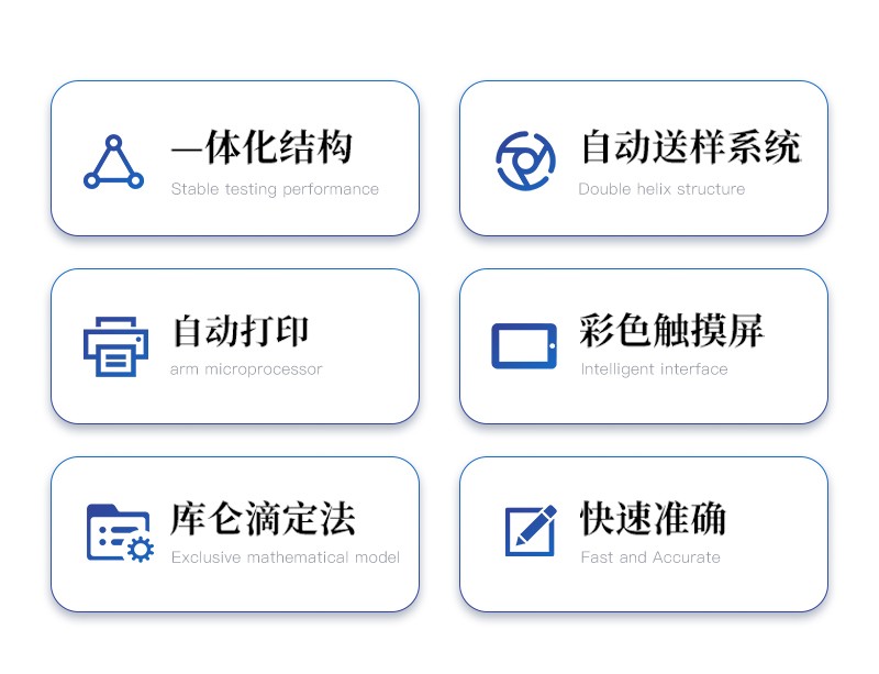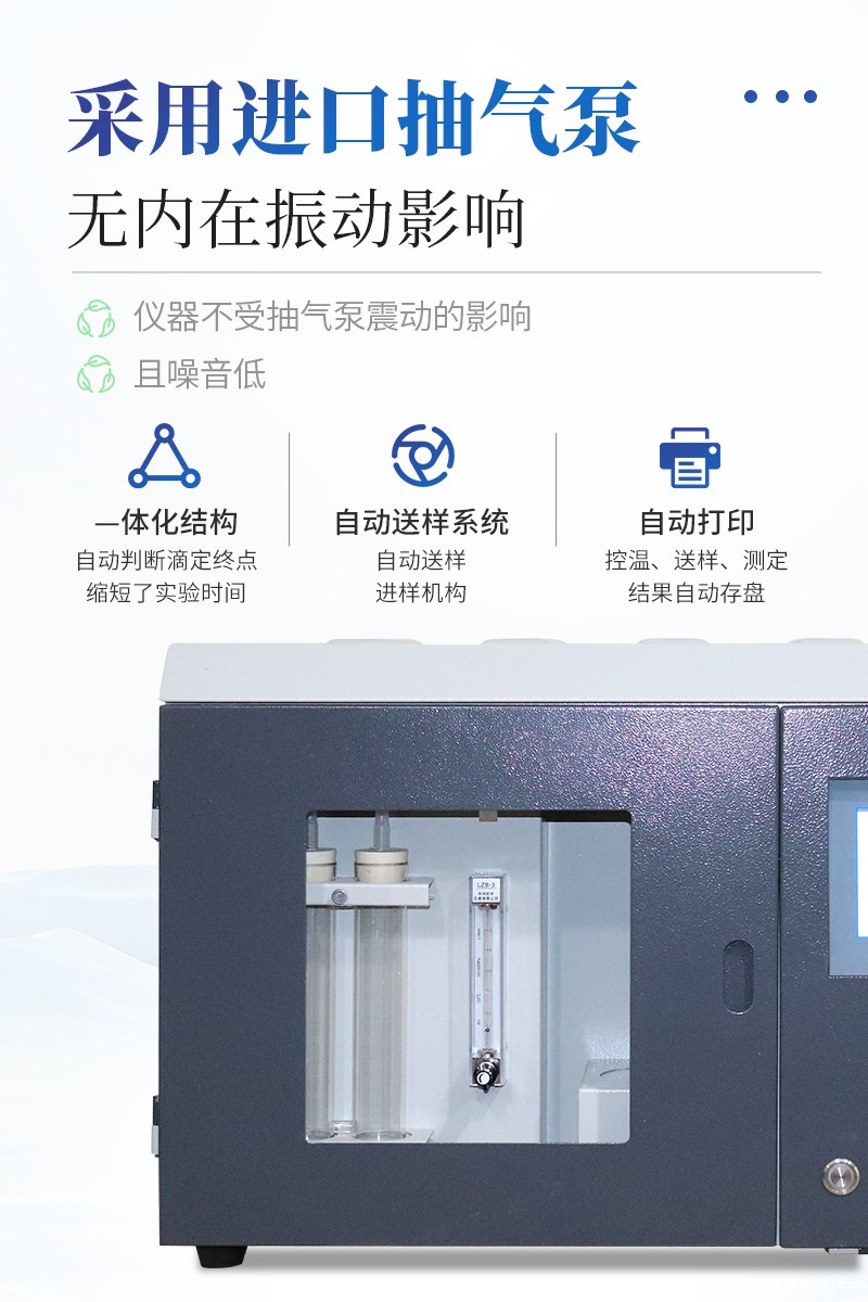 2、采用—体化结构,自动判断滴定终点,缩短了实验时间。所有关键部件均采用了设计理念及进行了严格的控制,确保仪器能长时间稳定运行。