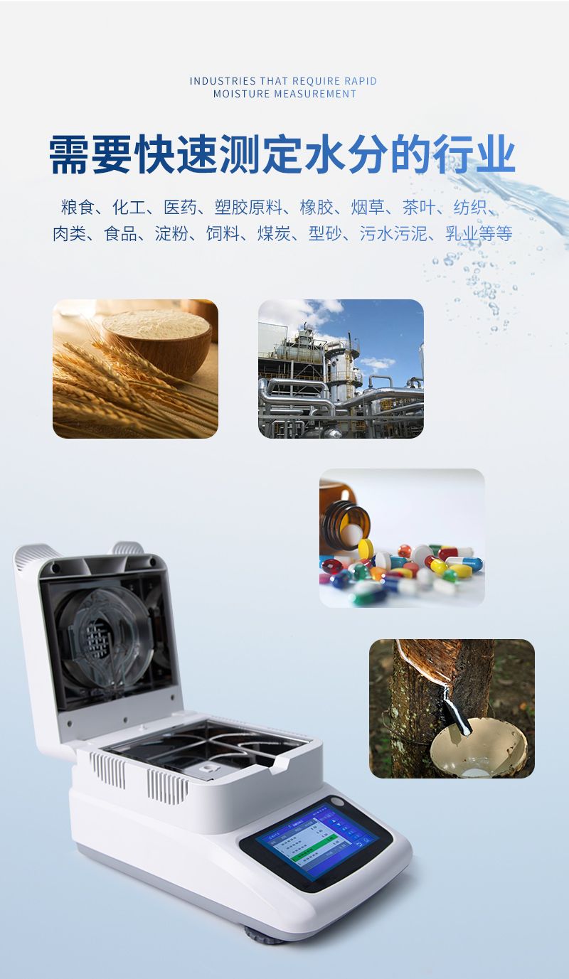 该系列快速水分测定仪应用于一切需要快速测定水分的行业,只要是颗粒状、粉末状、片状物、无挥发性液体均可测量,如:粮食、化工、医药、塑胶原料、橡胶、烟草、茶叶、纺织、肉类、食品、淀粉、饲料、煤炭、型砂、污水污泥、乳业等等;