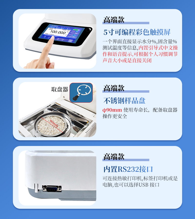该系列快速水分测定仪应用了国际烘箱干燥法原理,测定结果与烘箱法水分测定具有良好的一致性,工作效率却远远高于烘箱法水分测定,一般样品只需要几分钟即可测量完毕,因此受到广大用户的青睐与好评。