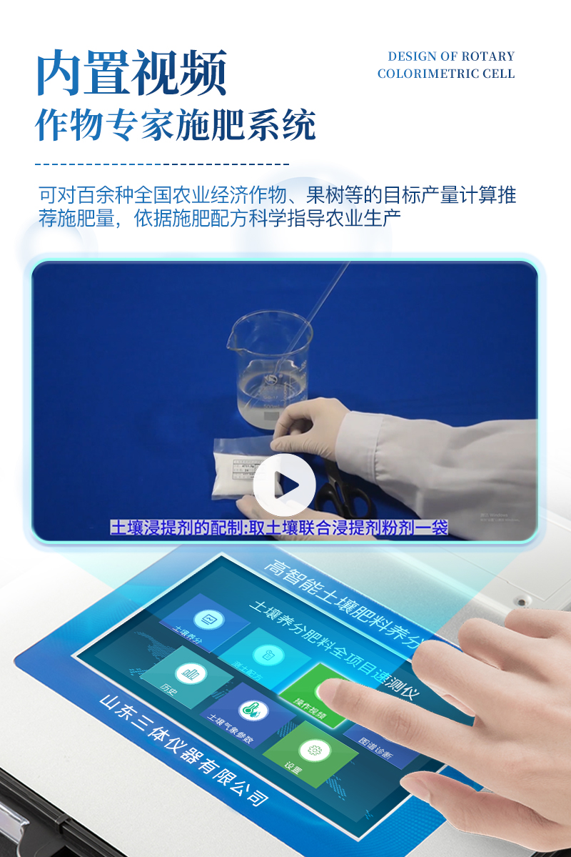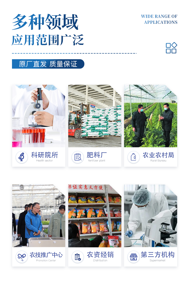 配套齐全:该仪器集药、器、仪为一体,携带方便,相当于一个小型移动实验室,无需用户自配附件,亦可灵活野外流动测试。适于农业服务部门或农资经销商、合作社、肥料厂商、大种植户测土施肥和鉴别肥料真假。