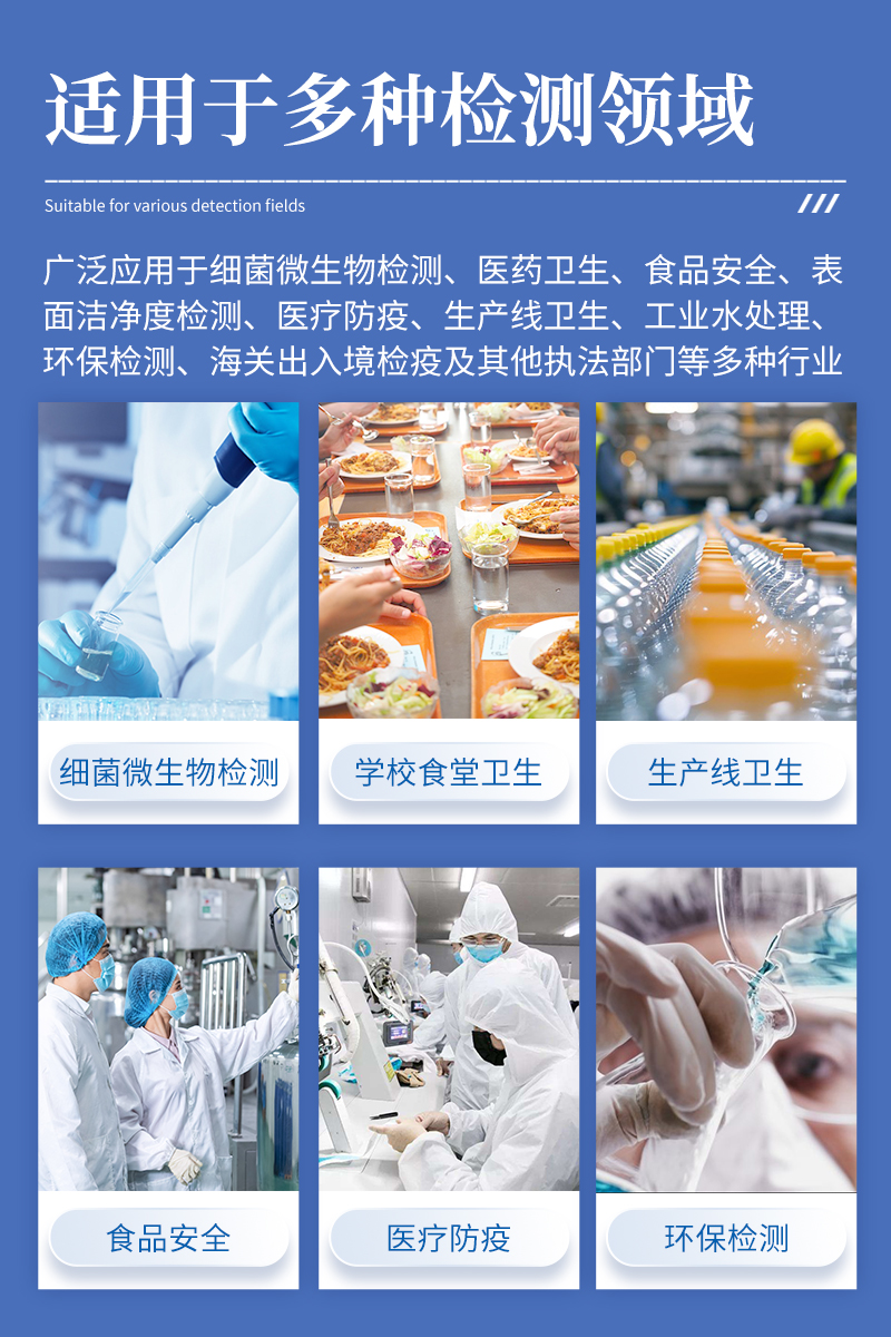 ATP荧光检测仪广泛应用于:细菌微生物检测、医药卫生、食品安全、市场执法、表面洁净度检测、**防疫、水质水政、生产线卫生、工业水处理、环保检测、海关出入境检疫及其他执法部门等多种行业。