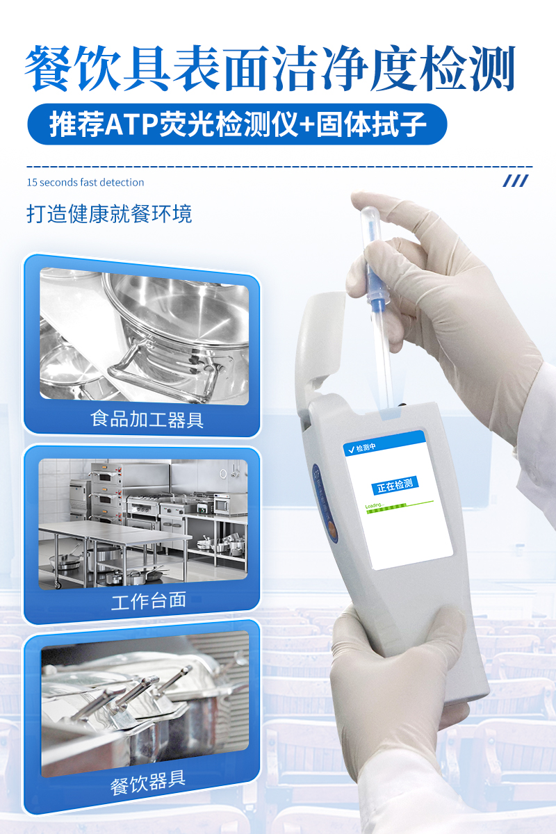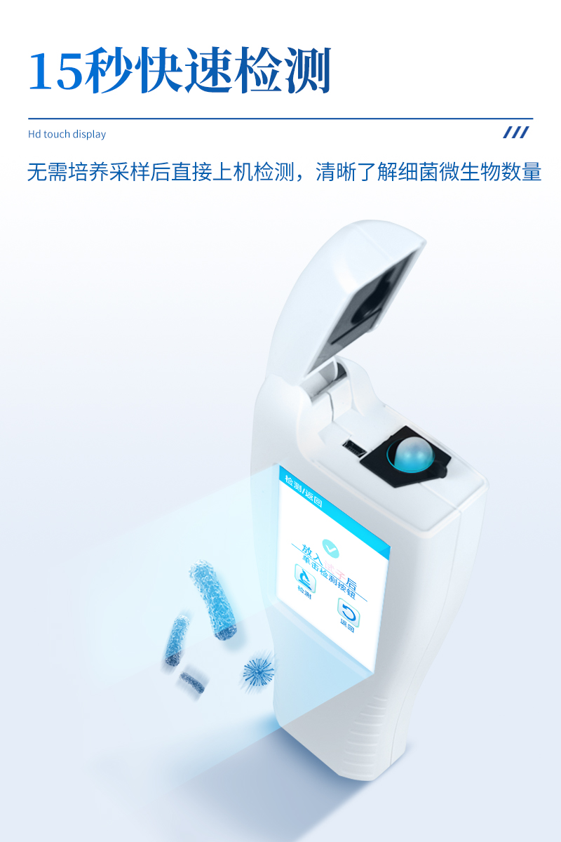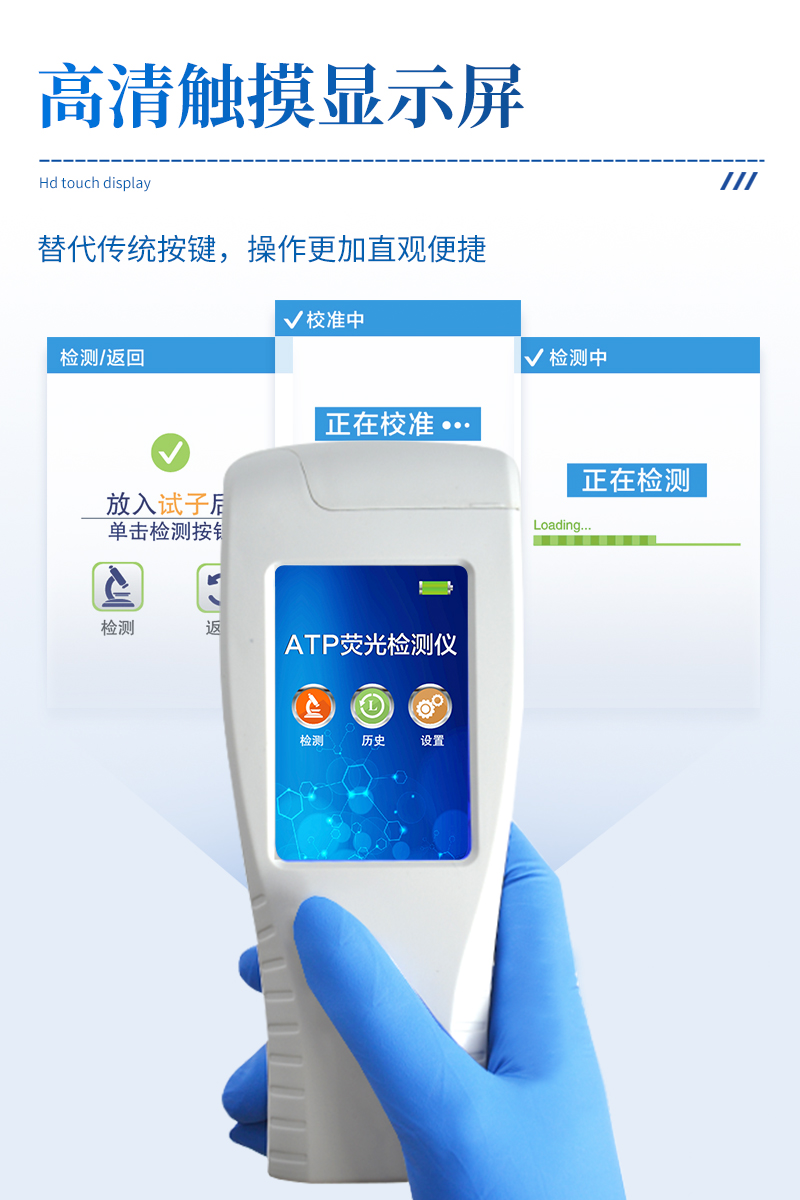 该设备为全新升级产品,安卓智能操作系统。操作采用生物化学反应方法检测ATP含量,ATP荧光检测仪基于萤火虫发光原理,利用“荧光素酶—荧光素体系”快速检测三磷酸腺苷(ATP)。ATP拭子含有可以裂解细胞膜的试剂,能将细胞内ATP释放出来,与试剂中含有的特异性酶发生反应,产生光,再用荧光照度计检测发光值,微生物的数量与发光值成正比,由于所有生物活细胞中含有恒量的ATP,所以ATP含量可以清晰地表明样品中微生物与其他生物残余的多少,用于判断卫生状况。